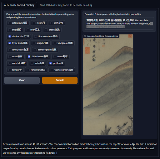 As an extension of this project, we created an AI Chinese Poem & Painting Generator, Idyllic, bridging the Chinese poem and painting through "AI memory". Click here to see the documentation of the generator.